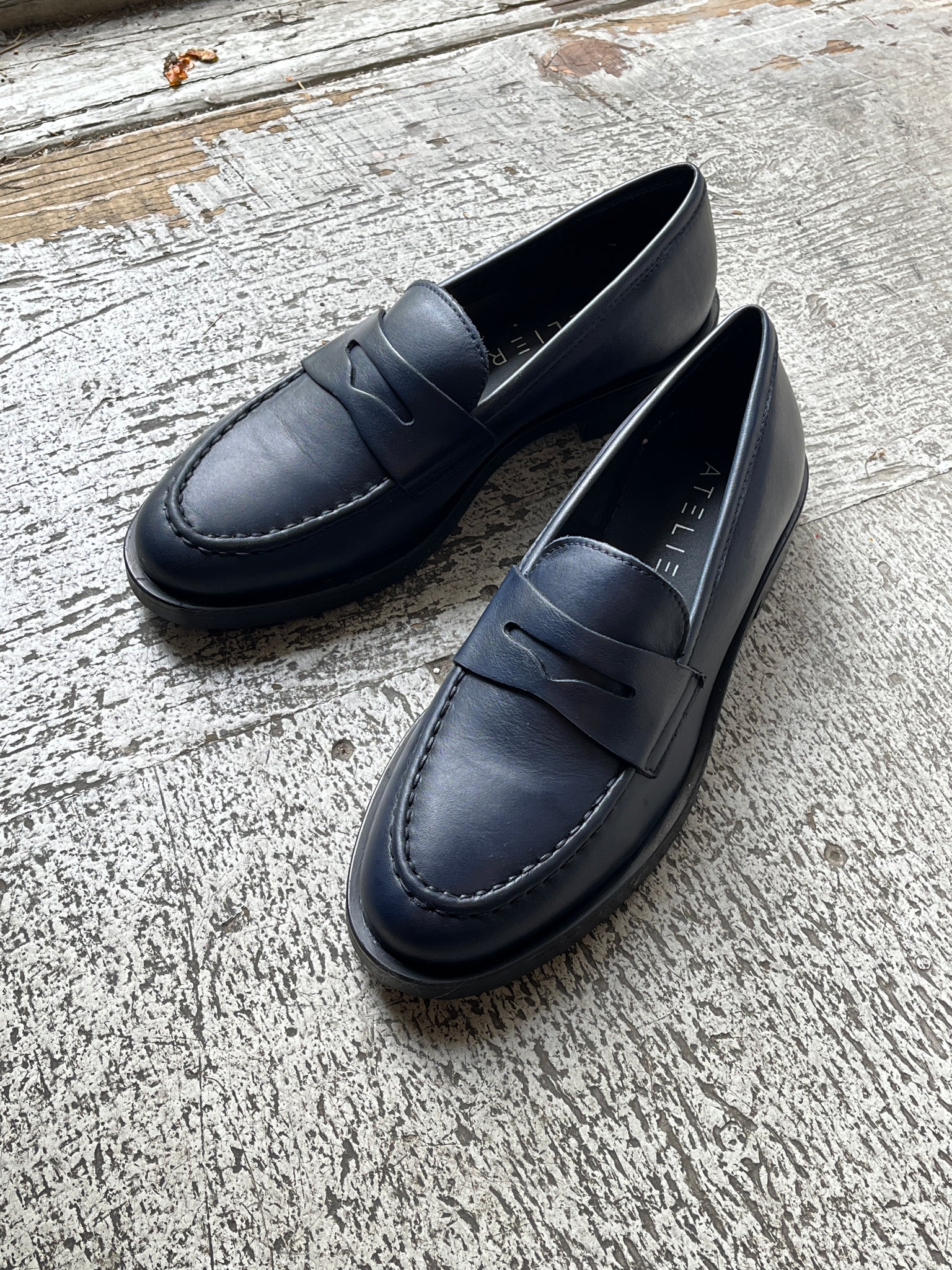 The "Carlos" Loafer from Ateliers features a comfortable, low block heel and a sleek slip-on style. The luxurious blue color and almond toe add an elegant touch to your casual or event outfit.