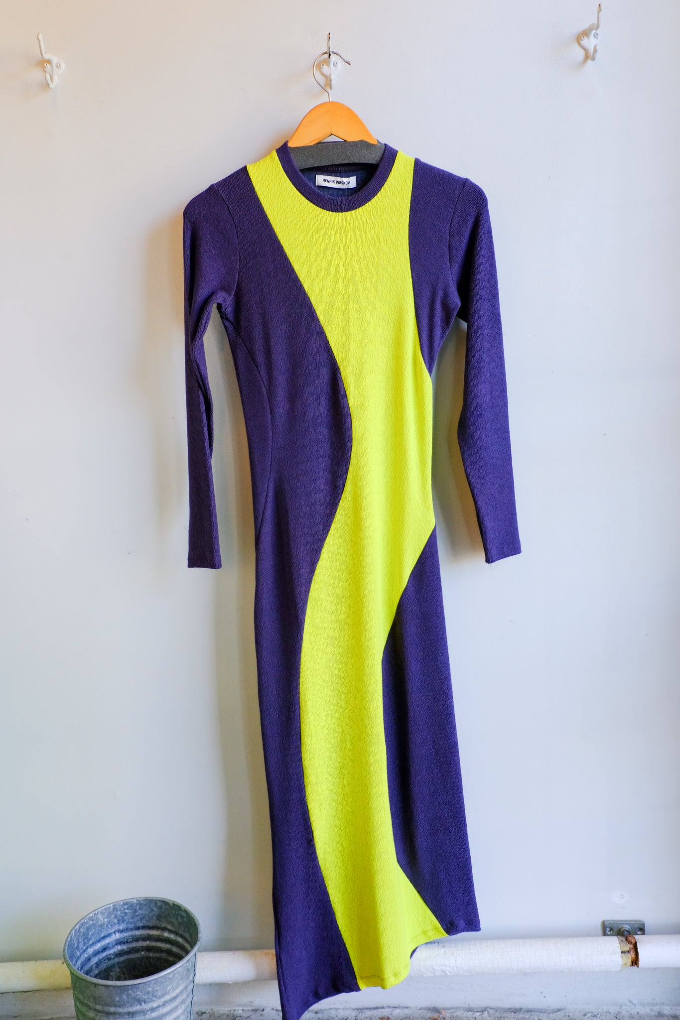 Textured jersey fitted dress with contrast swooping panel. The "Vertigo" in bi-colour navy and neon yellow features a fitted design, long sleeves, round neck, and a diagonal hem.