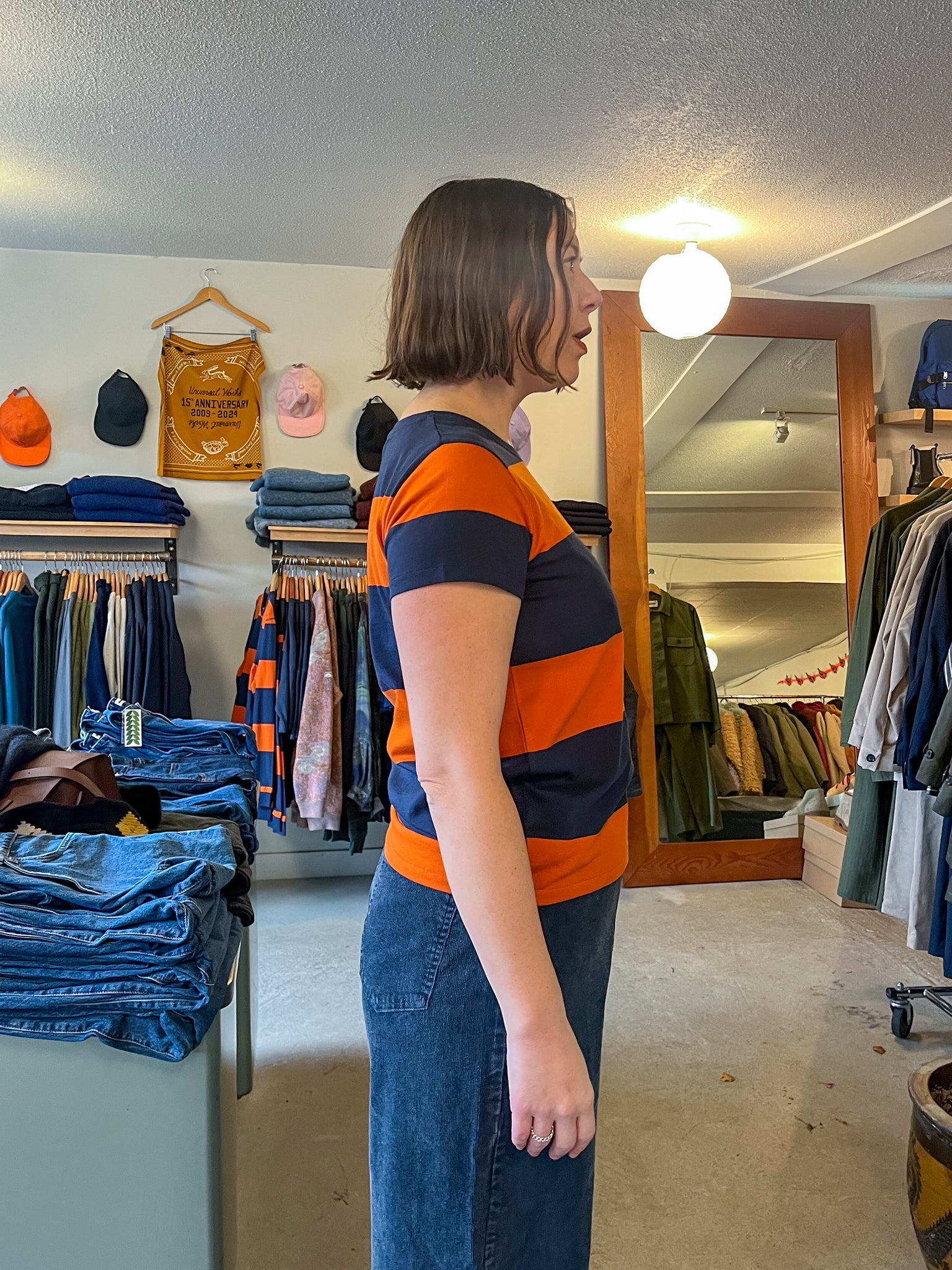 A classic style from YMC - the Day Shirt arrives this Fall Winter in navy and spice stripes. A thin, lightweight cotton jersey tee you'll truly want to wear every day. This seasonal staple features short sleeves, straight hems and a round neckline. Made from supple organic cotton, it's hard to find another quite like it.