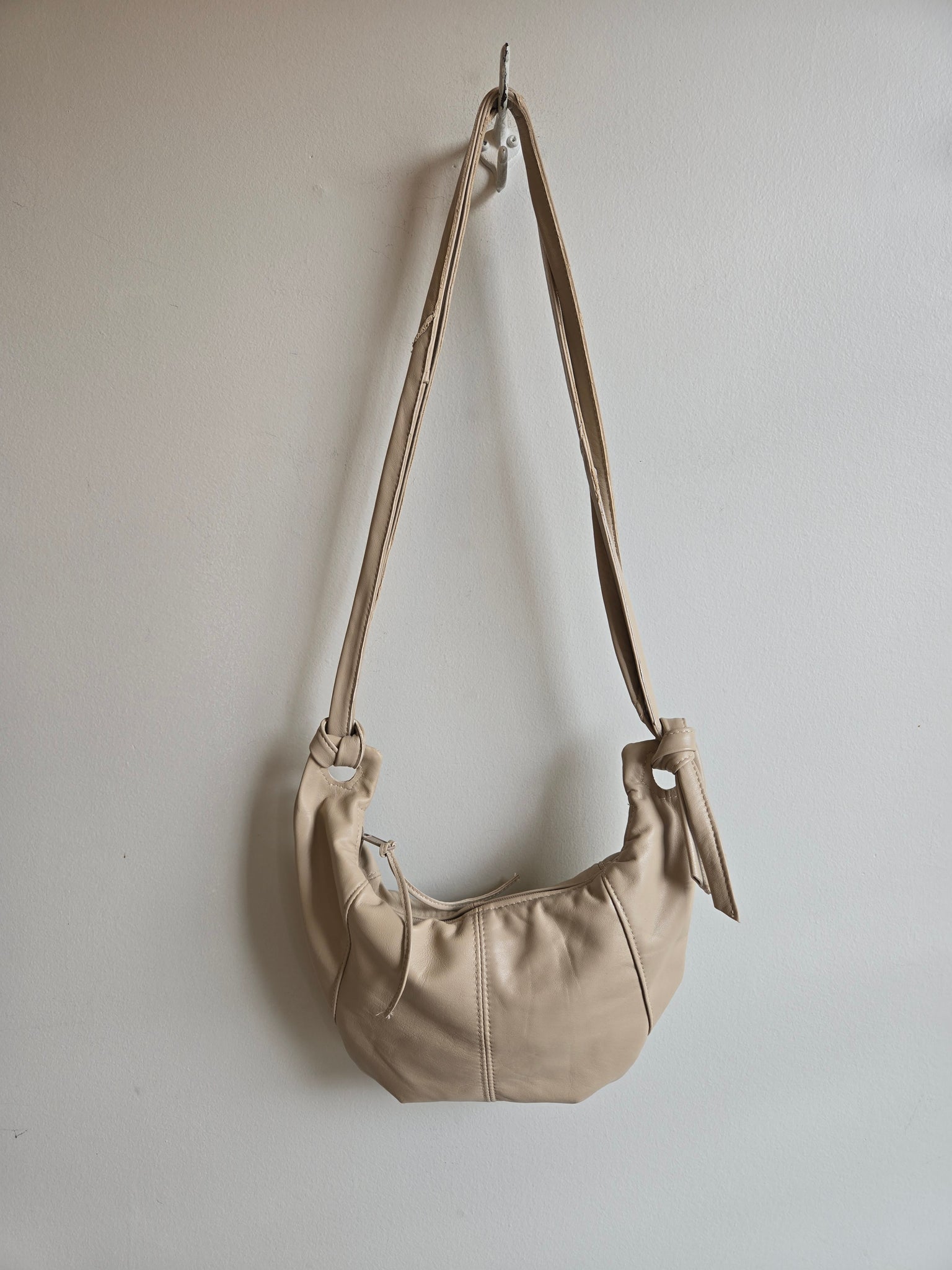 A leather sling style bag that's easily worn over the shoulder or across the body. Fully lined with an interior pocket and an adjustable knotted strap.